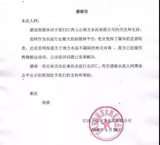 水泥人网报道的关于南方水泥不凝固的相关问题,引起了南方水泥的高度重视,随后江西玉山南方水泥与用户积极沟通,在最短的时间内为用户解决了相关问题。江西玉山南方水泥有限公司对于水泥人网的作法表示高度认可,并表示,水泥人网作为行业最大的新媒体平台,充分发挥了媒体的监督职责,感谢水泥人网秉承公平公正的原则给矛江西玉山南方水泥的支持和帮助。