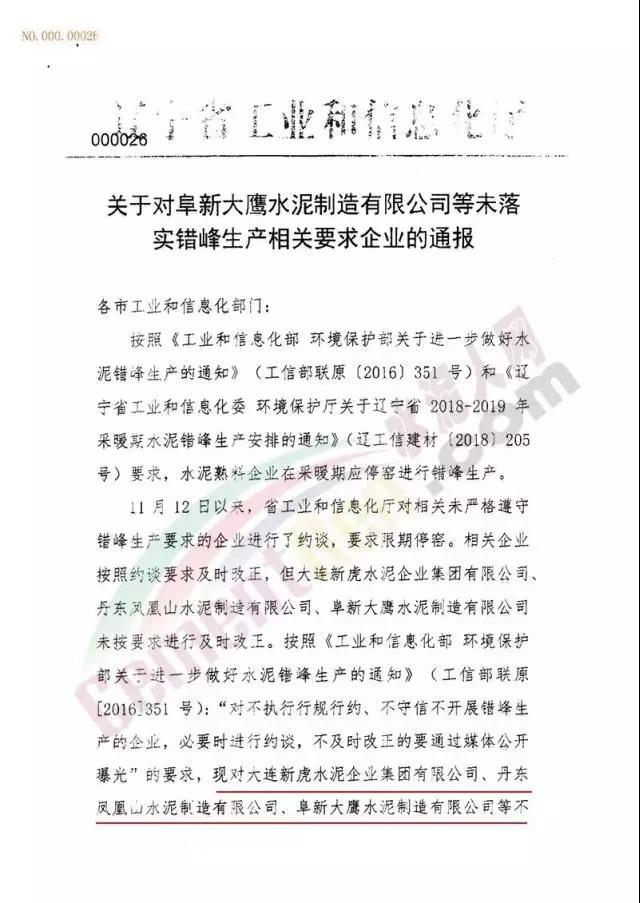近年来,水泥行业错峰生产成为常态,而一些企业却无视政策法规。2018年,辽宁大鹰水泥旗下子公司,曾两度违规无视政府文件,拒不执行省级错峰生产。