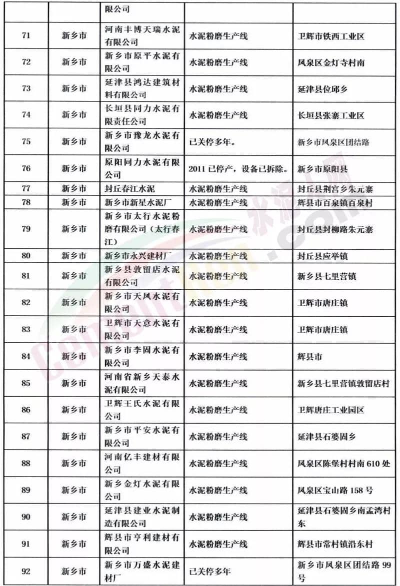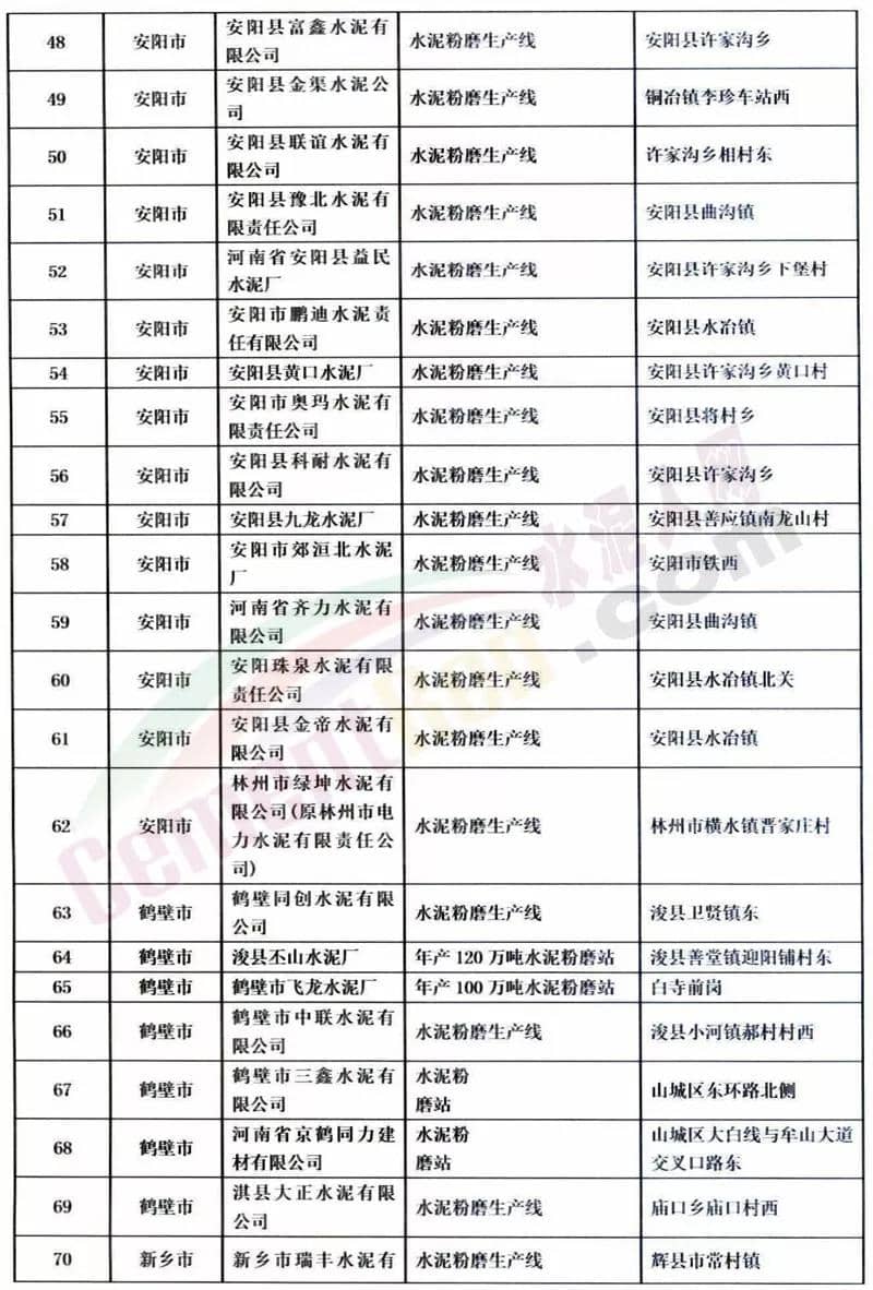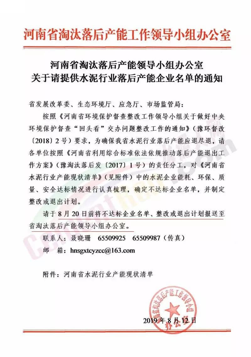 水泥人网消息:日前,河南省淘汰落后产能工作领导小组办公室发布《河南省淘汰落后产能领导小组办公室关于请提供水泥行业落后产能企业名单的通知》称,按照《河南省环境保护督查整改工作领导小组关于做好中央环境保护督查“回头看”交办问题整改工作的通知》(豫环督改(2018)2号要求,为确保河南省水泥行业落后产能应退尽退,请各单位按照《河南省利用综合标准依法依规推动落后产能退出工作方案》(豫淘汰落后发【2017】1号)的责任分工。