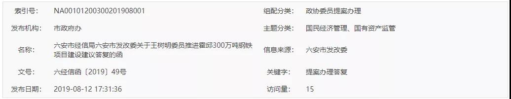 关于王树明委员推进霍邱300万吨钢铁项目建设建议答复的函