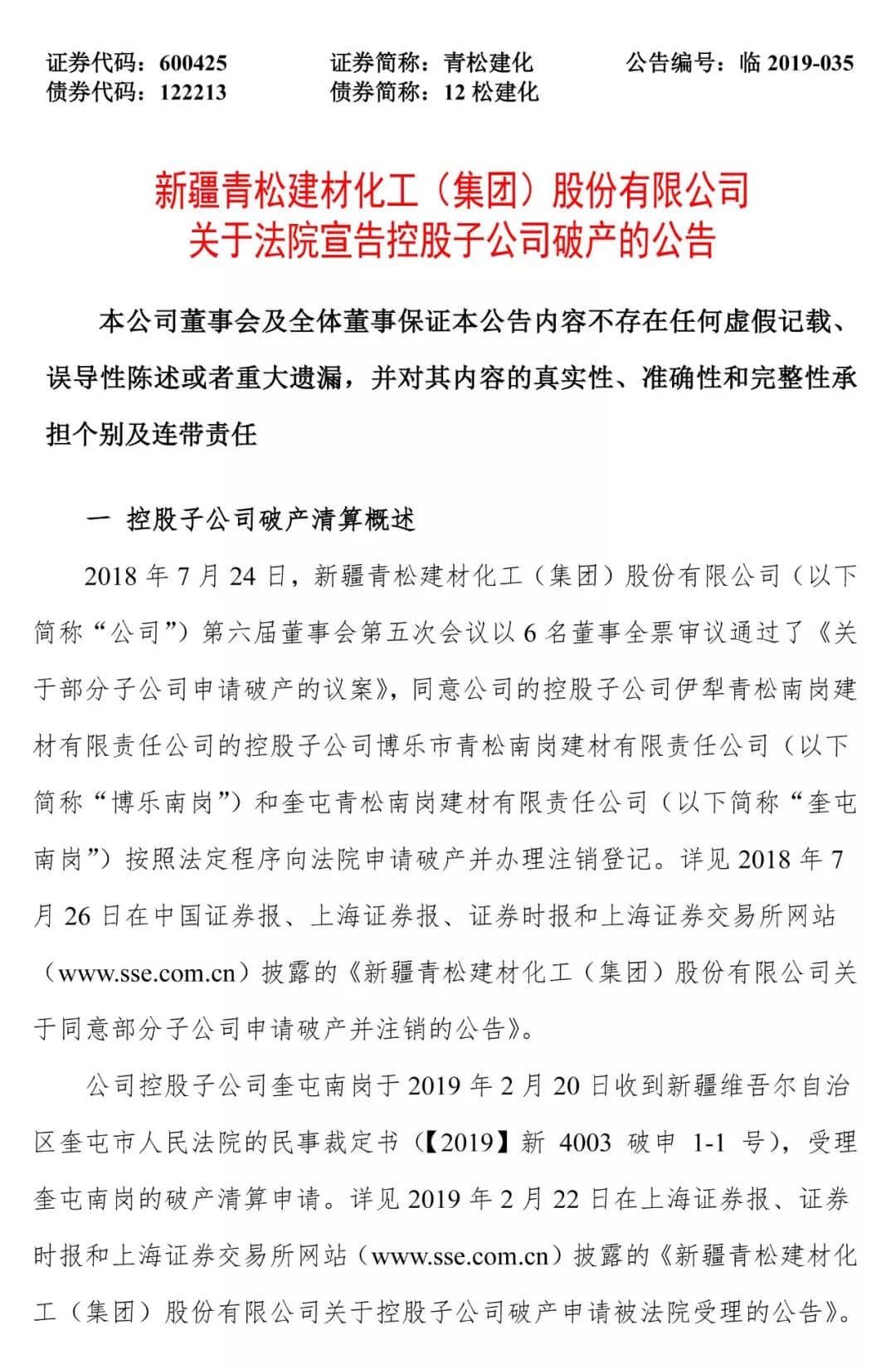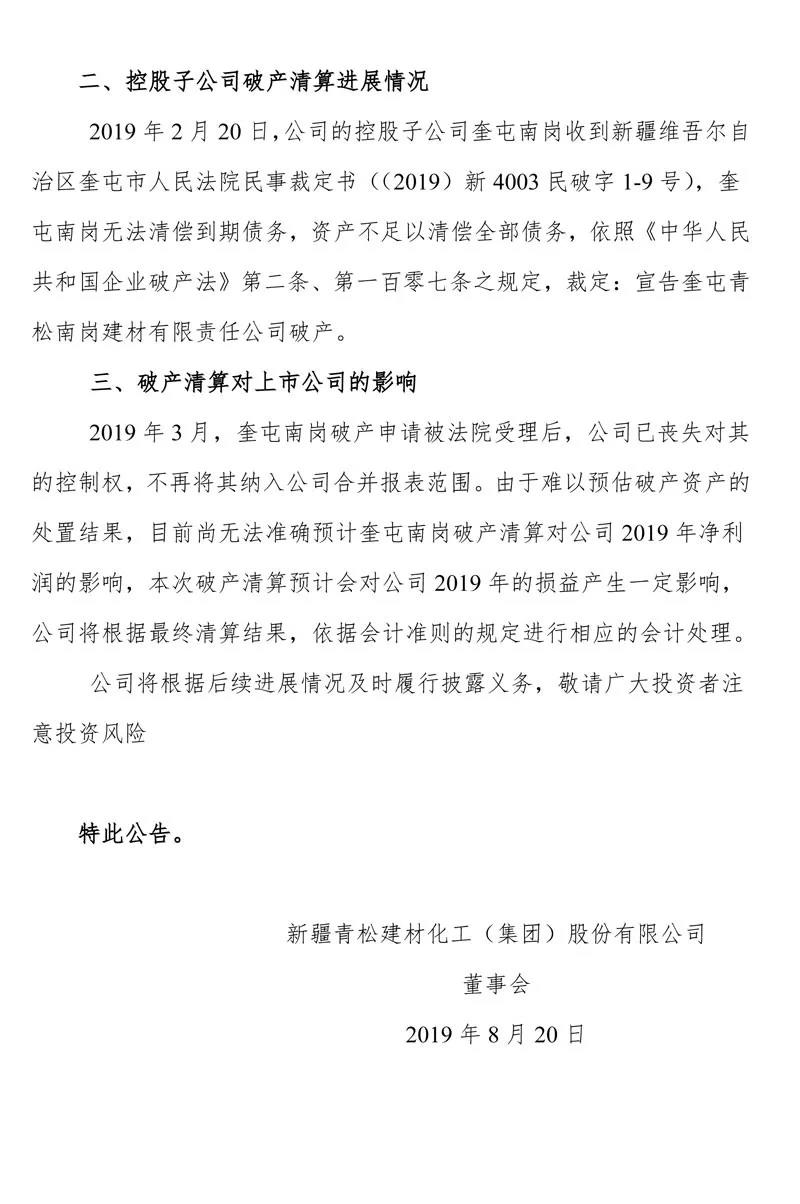 公司控股子公司奎屯南岗于2019年2月20日收到新疆维吾尔自治区奎屯市人民法院的民事裁定书(【2019】新4003破申1-1号),受理奎屯南岗的破产清算申请。详见2019年2月22日在上海证券报、证券时报和上海证券交易所网站(www.sse.com.cn)披露的《新疆青松建材化工(集团)股份有限公司关于控股子公司破产申请被法院受理的公告》