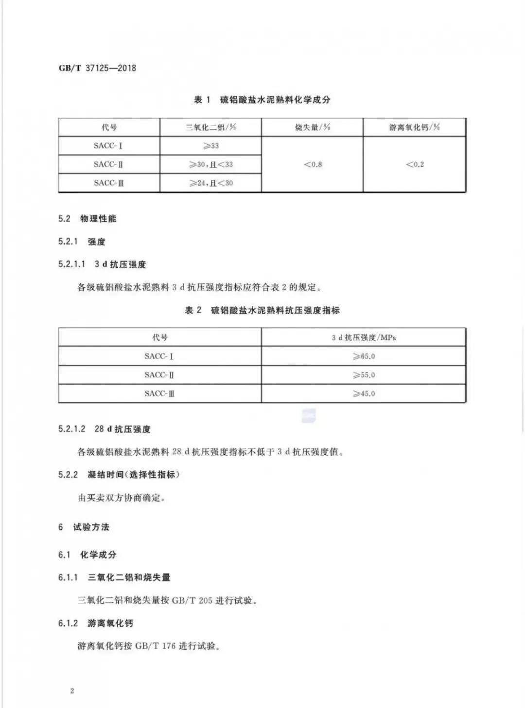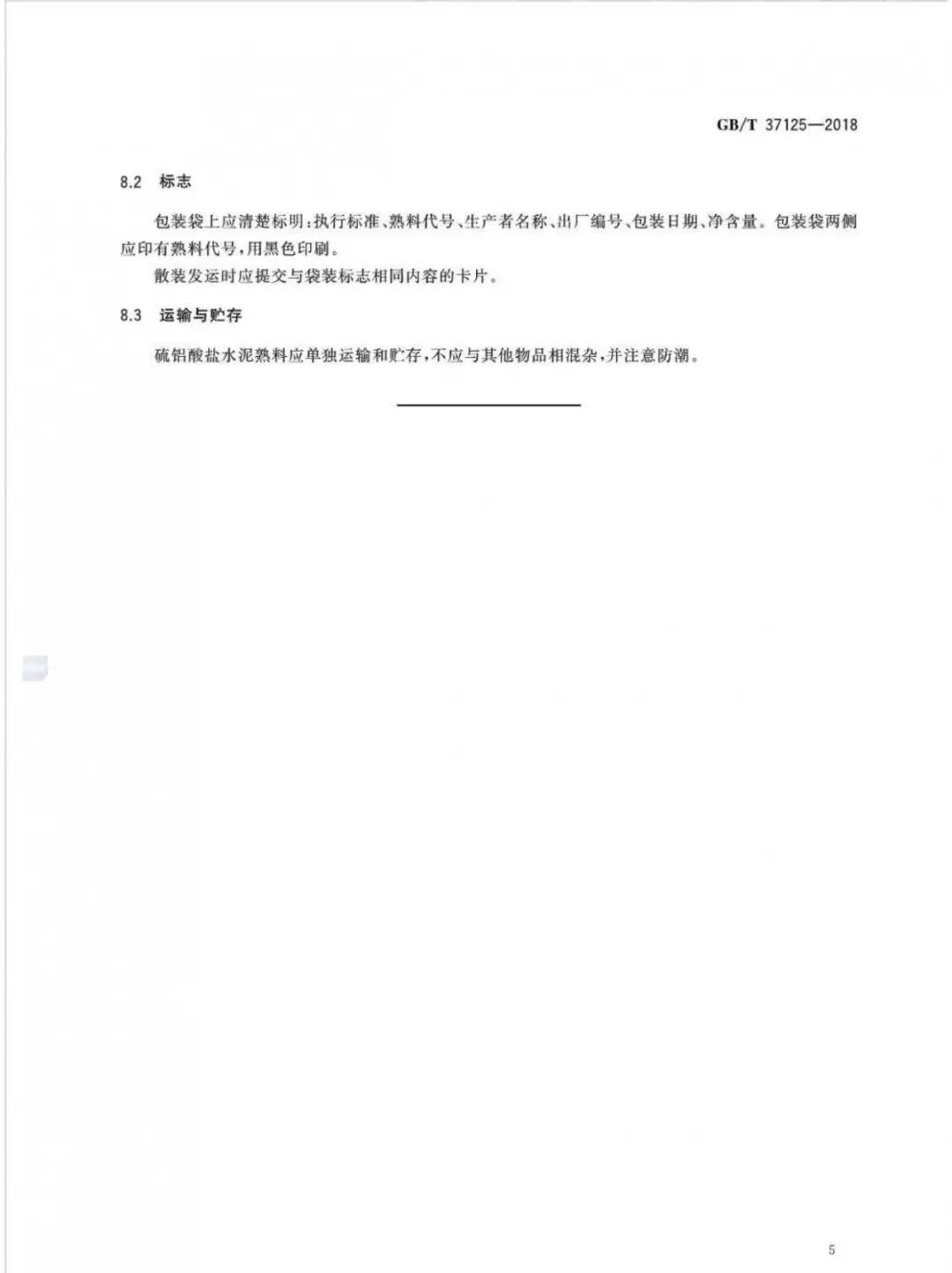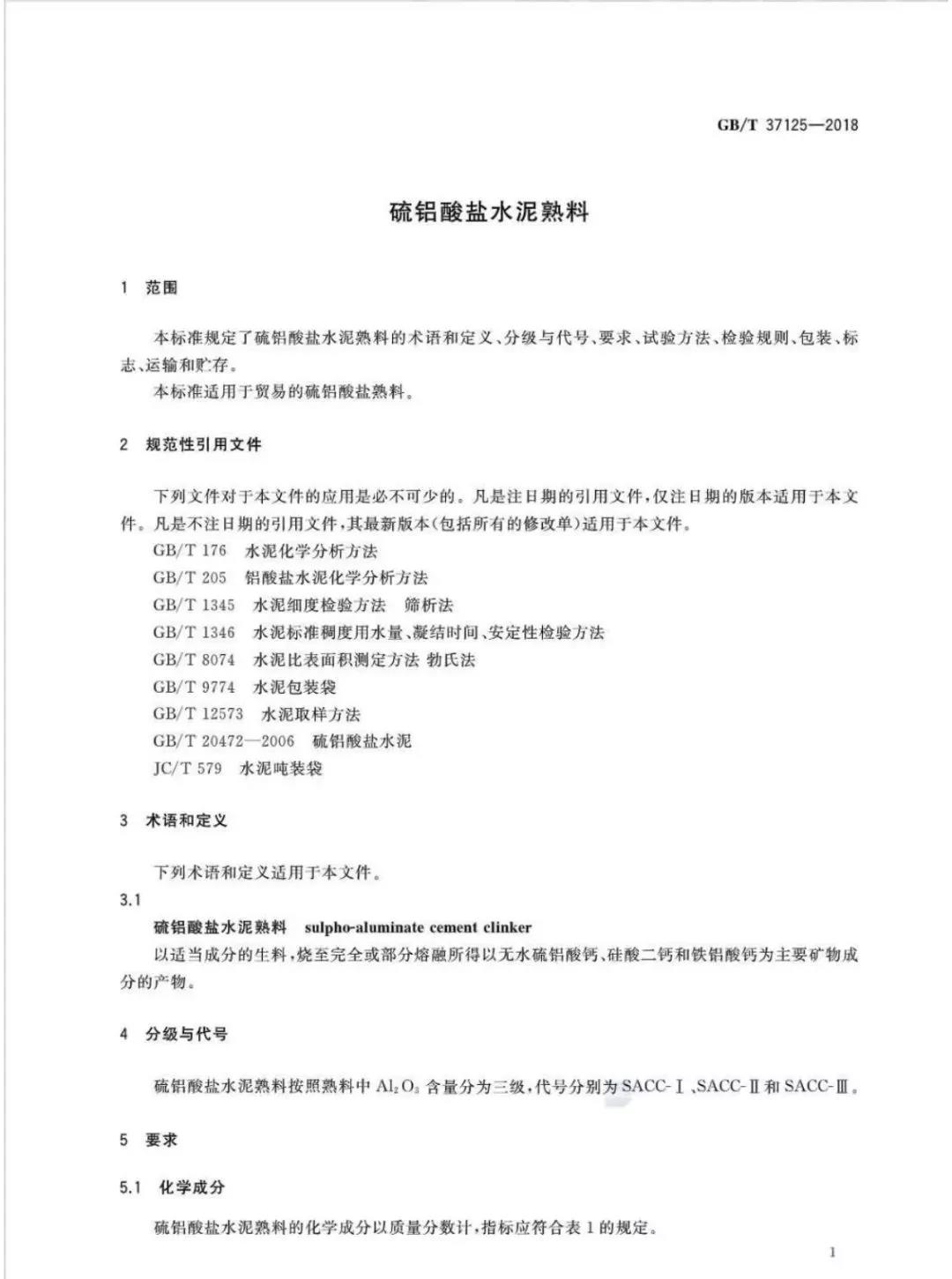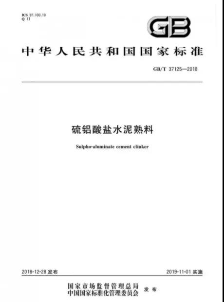 水泥人网消息:于2018年12月28日发布的GB∕T 37125-2018《硫铝酸盐水泥熟料》标准将于2019年11月1日开始实施。该标准适用于贸易的硫铝酸盐熟料,规定了硫铝酸盐水泥熟料的术语和定义、分级与代号、要求、试验方法、检验规则、包装、标志、运输和贮存。