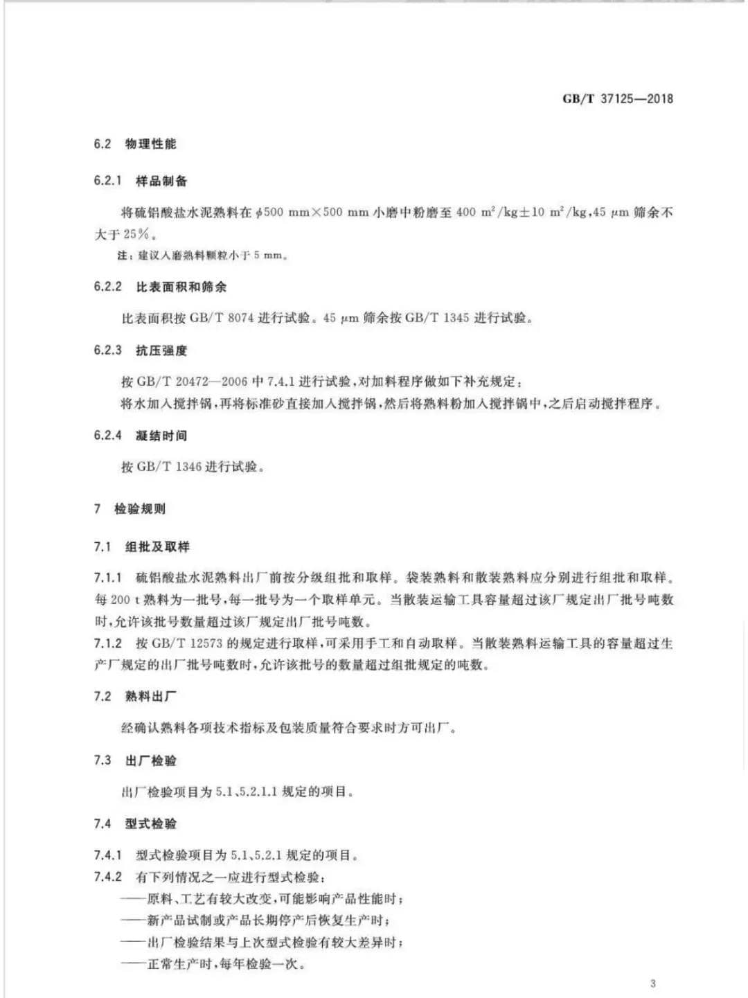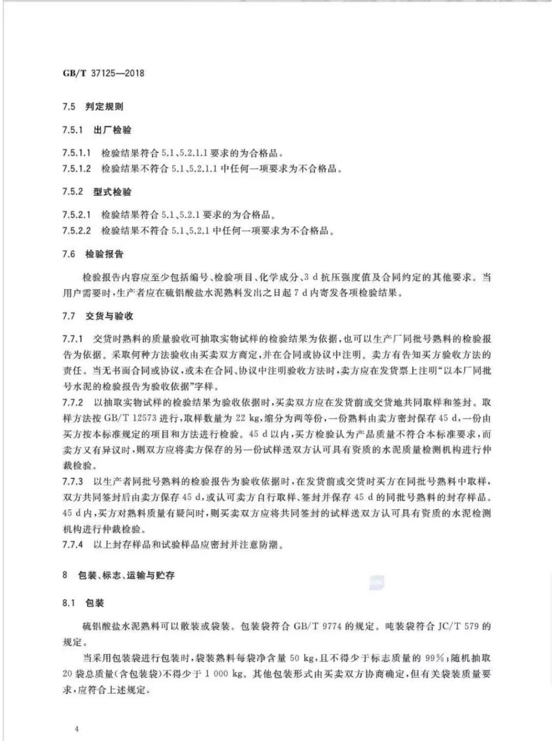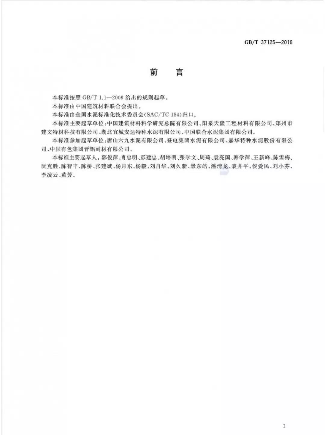 水泥人网消息:于2018年12月28日发布的GB∕T 37125-2018《硫铝酸盐水泥熟料》标准将于2019年11月1日开始实施。该标准适用于贸易的硫铝酸盐熟料,规定了硫铝酸盐水泥熟料的术语和定义、分级与代号、要求、试验方法、检验规则、包装、标志、运输和贮存。