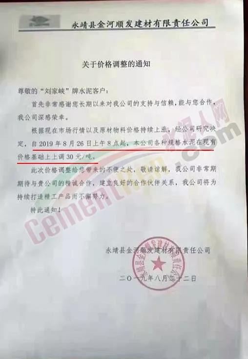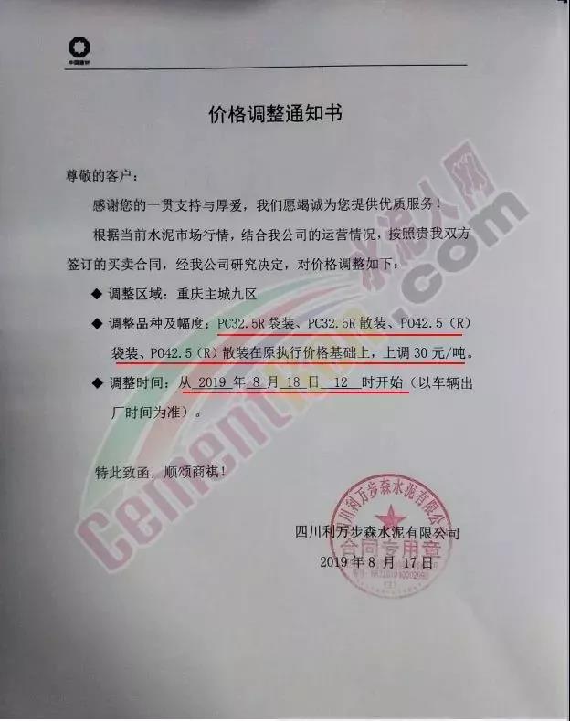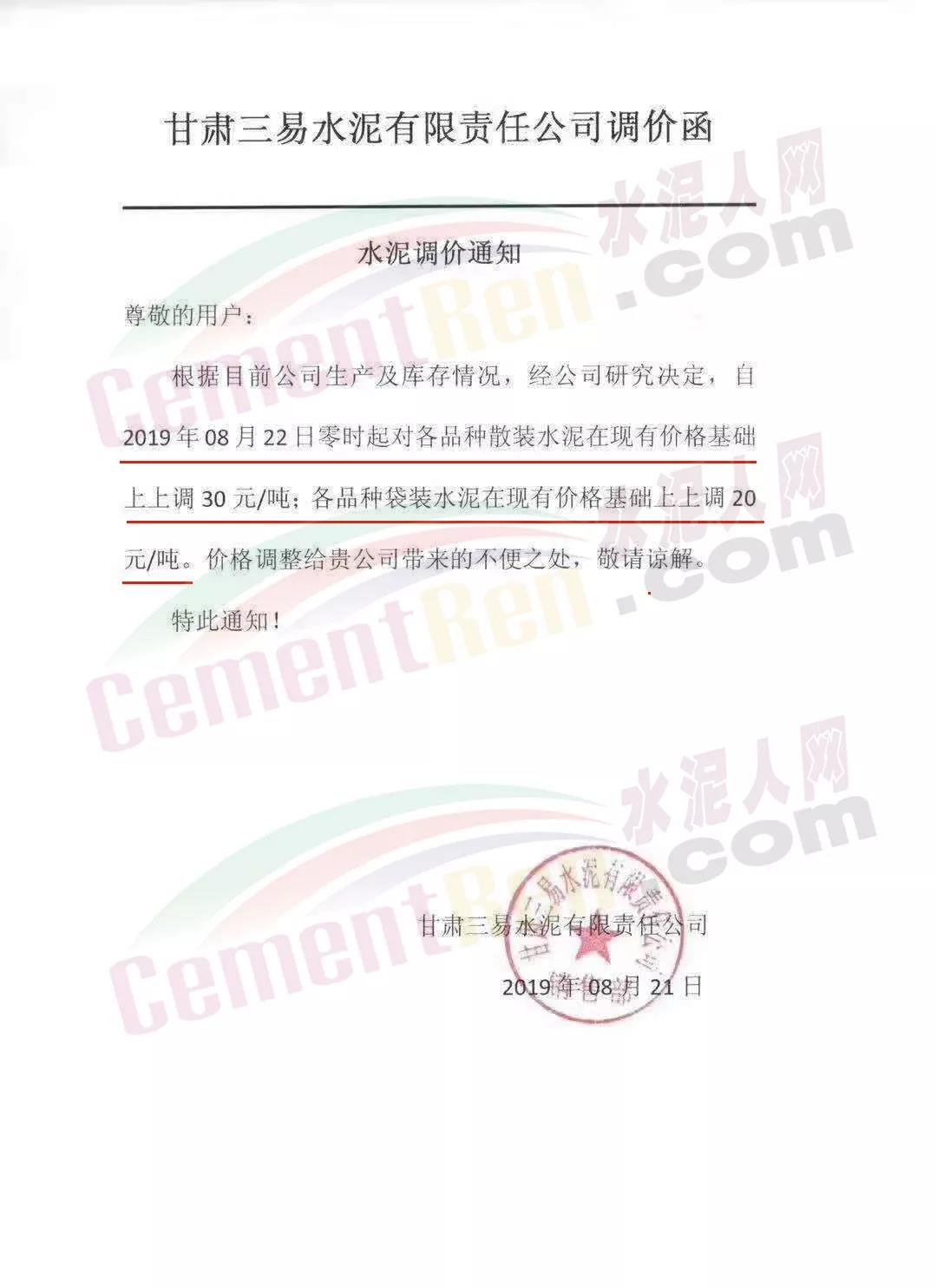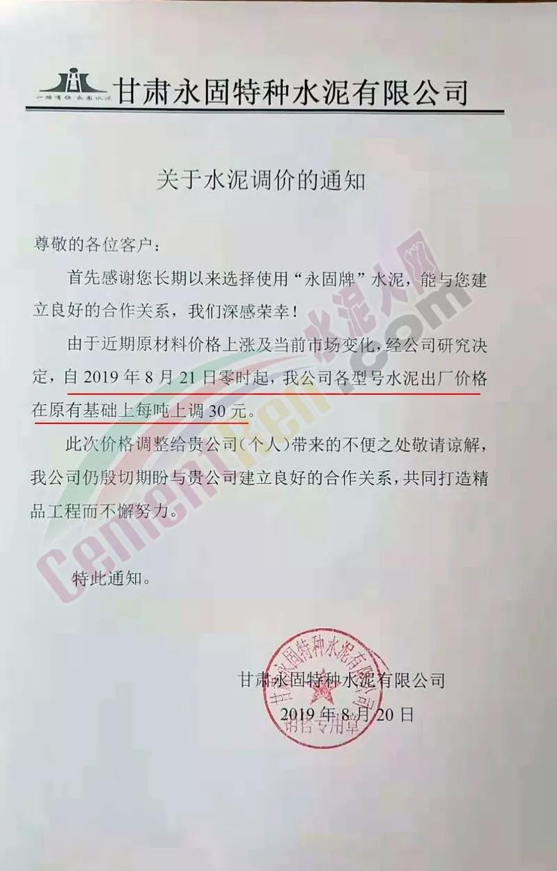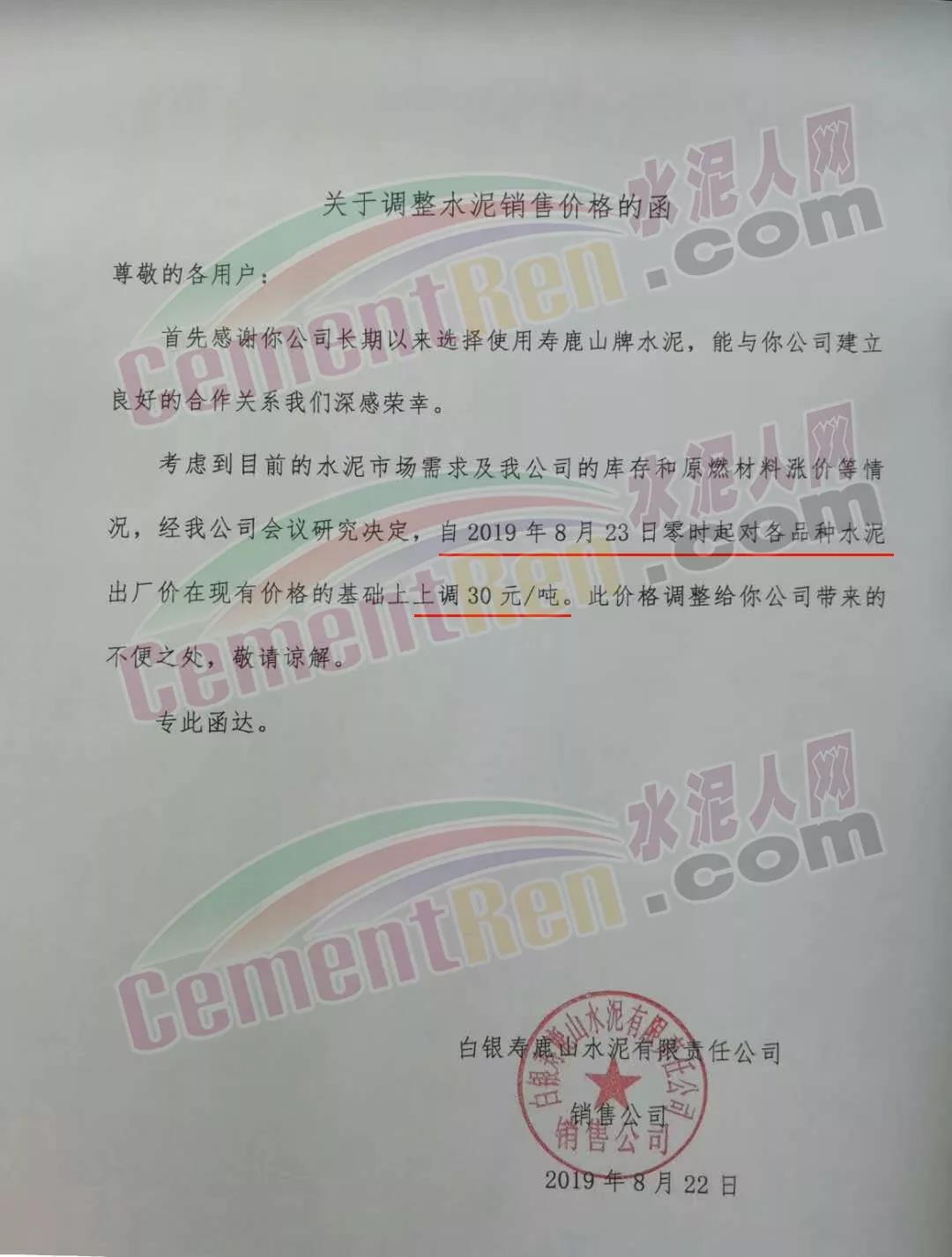 根据当前市场形势经我公司研究决定,自2019年08月22日上午9:00点起所有水泥品种价格统一上调30元/吨。