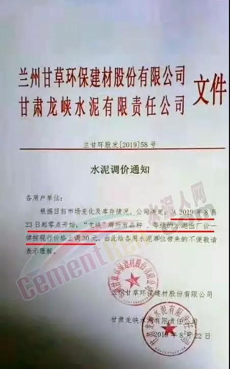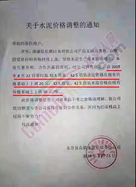 经公司商议决定自2019年8月22日上午9:30分整,32.5水泥袋装、散装每吨上调10元;42.5水泥袋装、散装每吨上调10元,特此通知!