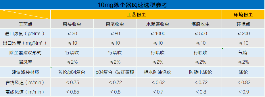 表一 10mg除尘器选型参考