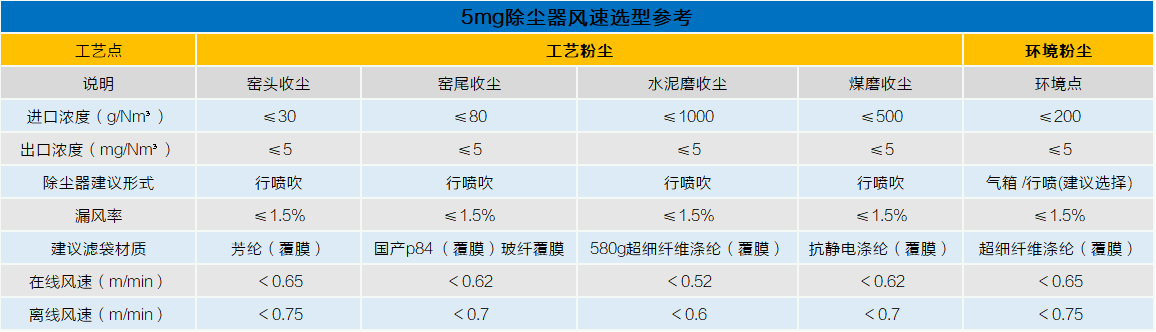 表二 5mg除尘器选型参考