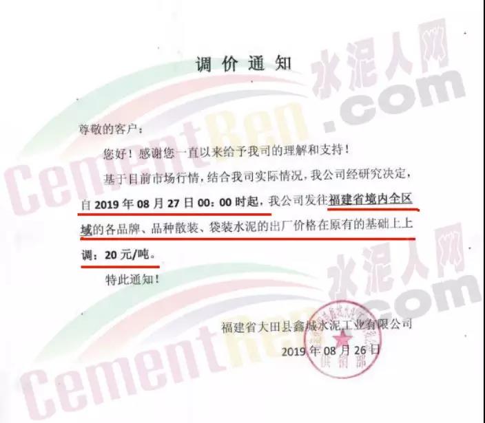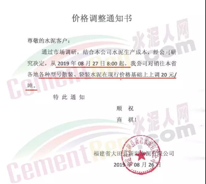 8月26日,福建省大田县鑫城水泥工业有限公司发布调价通知称:基于目前市场行情,结合我司实际情况,我公司经研究决定,自2019年8月27日00:00时起,我公司发往福建省境全区域的各品牌、品牌散装、袋装水泥的出厂价格在原有的基础上上调20元/吨。