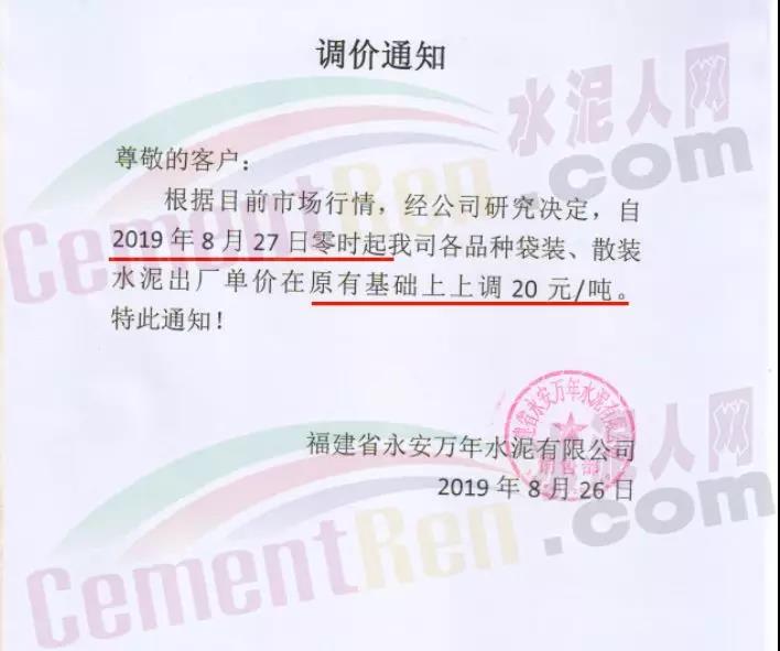 8月26日,福建省永安万年水泥有限公司发布调价通知称:根据目前市场行情,经公司研究决定,自2019年8月27日零时起我司各品种袋装、散装水泥出厂单价在原有基础上上调20元/吨。这是福建永安万年水泥8月份第二次提价,累计上调40元/吨。