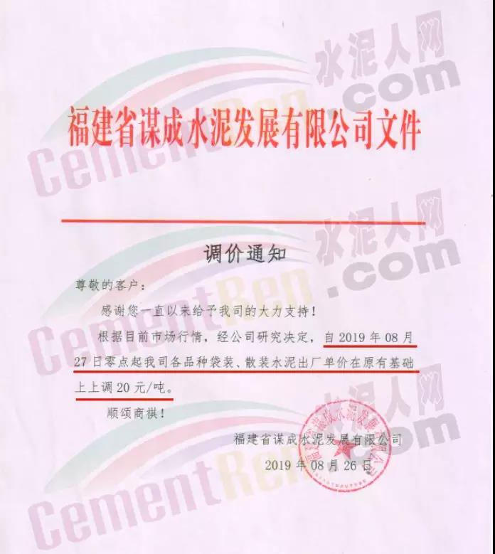 8月26日。福建省谋成水泥发展有限公司发布调价通知称:根据目前市场行情,经公司研究决定,自2019年8月27日零时起,我司各品种袋装、散装水泥出厂单价在原有基础上上调20元/吨,本次调价为谋成水泥8月份的第二调价,累计上调40元/吨。