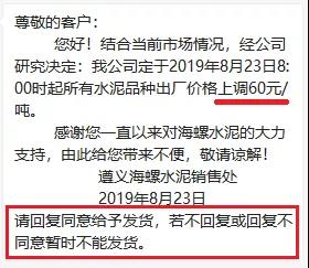 金牛水泥特别强调,收到通知请签字回传,如未见回传将于次日停止所有水泥的发货。这是福建金牛水泥8月份的第二次提价,累计上调40元/吨。