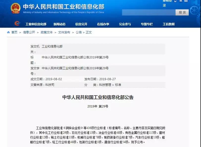 日前,工信部网站发布了2019年第29号公告。公告表明,工业和信息化部批准《铜锌合金粉》等436项行业标准(标准编号、名称、主要内容及实施日期见附件),其中化工行业标准29项、石化行业标准13项、冶金行业标准48项、有色金属行业标准115项、建材行业标准12项、稀土行业标准11项、机械行业标准78项、制药装备行业标准7项、汽车行业标准13项、船舶行业标准7项、轻工行业标准48项、包装行业标准1项、通信行业标准54项,现予公布。