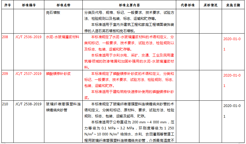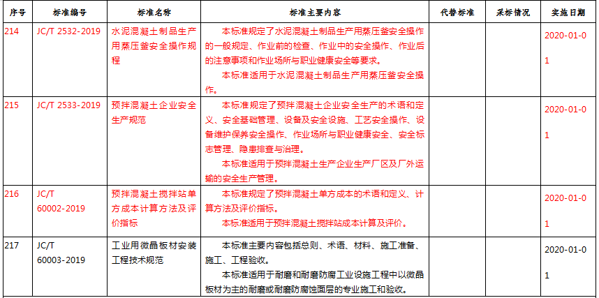 水泥行业:标准编号为JC/T 2536-2019的水泥-水玻璃灌浆材料;标准编号为JC/T 2537-2019的磷酸镁修补砂浆;标准编号为JC/T 2532-2019的水泥混凝土制品生产用蒸压釜安全操作规程;标准编号为JC/T 2533-2019的预拌混凝土企业安全生产规范;标准编号为JC/T 60002-2019的预拌混凝土搅拌站单方成本计算方法及评价指标;这些标准被工信部批准,并且上述这些标准实施日期都是2020年1月1日。