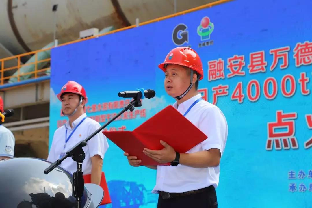 融安县委书记陈宏在致辞中表示,融安县万德七星水泥有限责任公司新型干法水泥生产线技改项目点火投料,标志着融安县有史以来投资规模最大的工业项目全面竣工试产。是融安县企业兼并重组、产业转型升级示范性项目。项目的建设对优化县工业结构、完善工业产业布局、扩大就业机会和推动县域经济发展等方面都具有十分重要的意义。希望万德七星水泥有限责任公司以点火投料为契机,继续发挥自身产业优势,优化经营管理,在融安这片充满生机和活力的热土上大展宏图,创造出更加辉煌灿烂的业绩、为融安县建设柳州市域次中心城市作出积极贡献。
