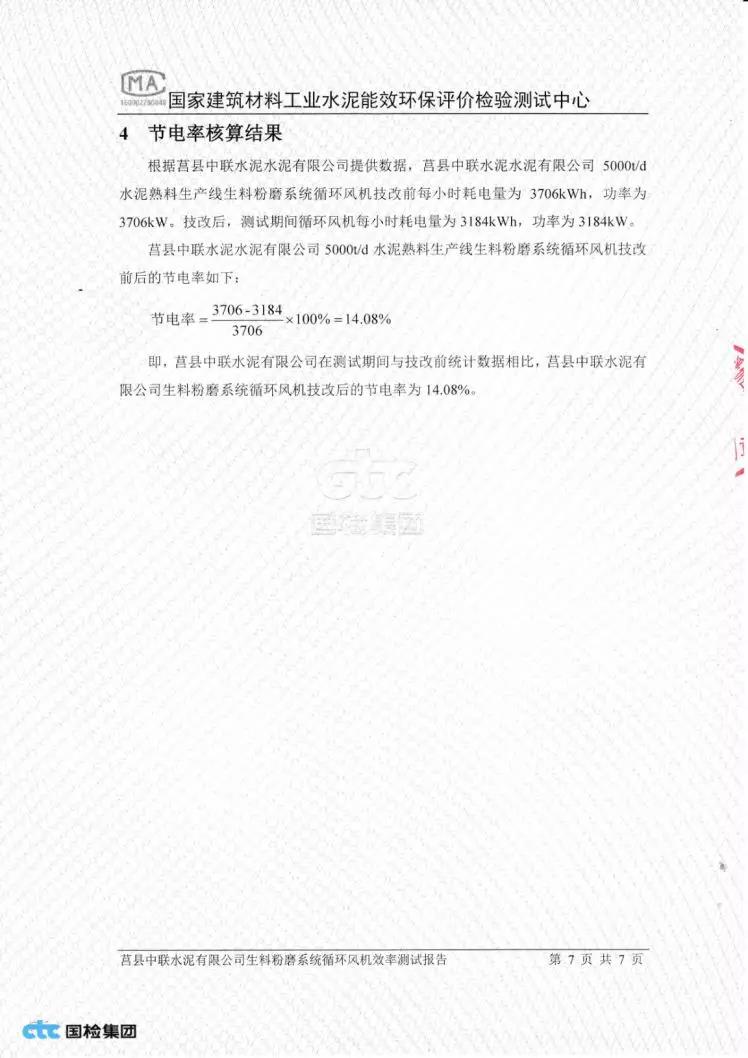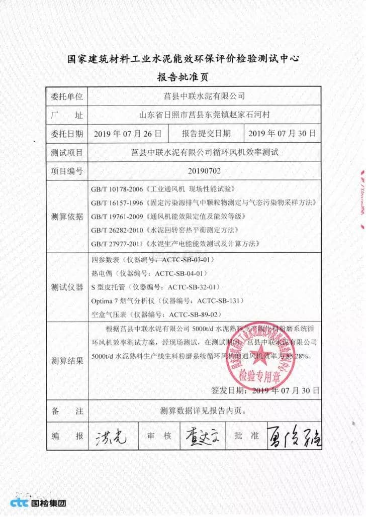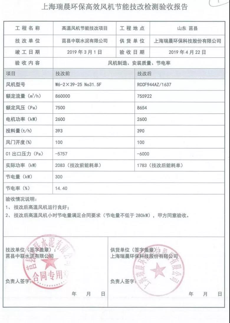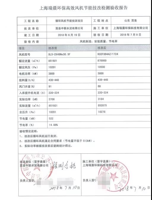 2019年7月29日,国家建筑材料工业水泥能效环保评价检验测试中心对莒县中联水泥有限公司生料磨系统循环风机进行了现场测试,测试结果表示瑞晨技改后的风机效率为85.28%,节电率为14.08%。