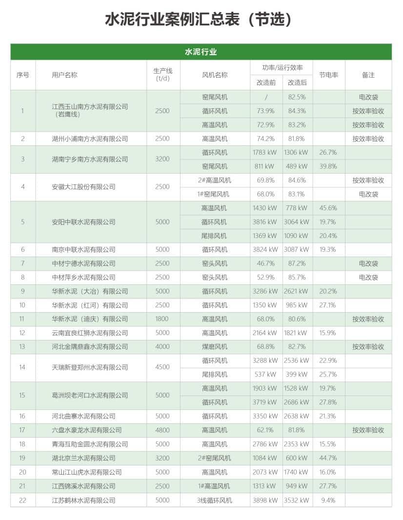 据瑞晨陈总介绍,公司高效风机广受行业欢迎,目前已经在中建材(南方水泥、中联水泥、中材水泥)、华新、葛洲坝、天瑞、金隅等多家水泥企业集团有稳定运行业绩,超过300余台窑头窑尾、高温、循环、除尘风机等在生产线服役,均为业主方带来了可观回报,以下摘选部分案例展示: