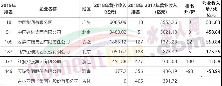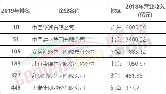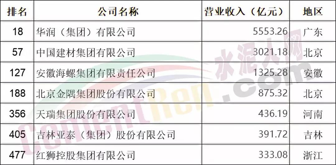 水泥行业的中国华润有限公司、中国建材集团有限公司、安徽海螺集团有限责任公司、北京金隅集团股份有限公司、红狮控股集团有限公司、天瑞集团股份有限公司等多家企业榜上有名。上述六家企业2018年营业收入合计13329.98亿元。占500强榜单总营业收入的791000亿元的1.69%。