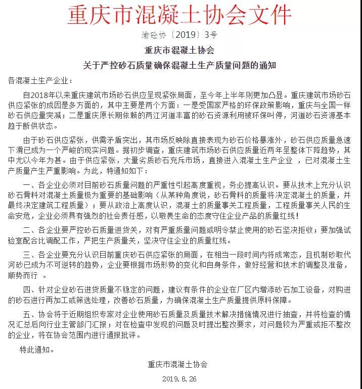 据水泥人网了解,目前混凝土的质量问题已经起了各地质检部门以及各地协会组织的高度重视,8月26日,重庆市混凝土协会发布《关于严控砂石质量确保混凝土生产质量问题》的通知,提出如下要求: