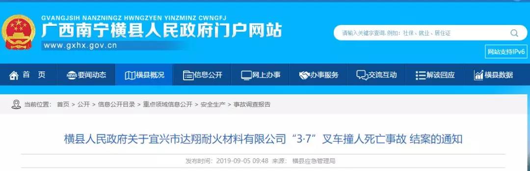 根据国务院《生产安全事故报告和调查处理条例》的规定和县人民政府的授权,县应急管理局牵头成立了由县公安局、人力资源和社会保障局、总工会等部门共同组成宜兴市达翔耐火材料有限公司“3·7”叉车撞人死亡事故调查组,同时邀请县监察委派员参加事故调查。经事故调查组调查取证,查明了事故发生的经过和原因,分清了事故责任,并对事故相关单位及其相关责任人提出了处理建议和防范措施,形成了事故调查报告,并经第十七届横县人民政府第86次常务会议审议通过。现将事故结案的有关事项通知如下: