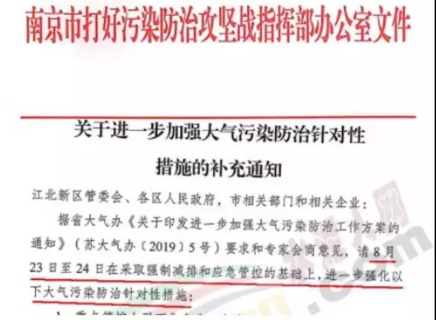 8月23日南京市打好污染防治攻坚战指挥部办公室发布《关于进一步加强大气污染防治针对性措施的补充通知》要求相关企业8月23日至8月24日在采取强制减排和应急管控的基础上,进一步强化大气污染防治针对性措施。针对于水泥行业,实施上风向区域水泥企业停产。江南、小野田水泥有限公司、中国水泥厂停产。