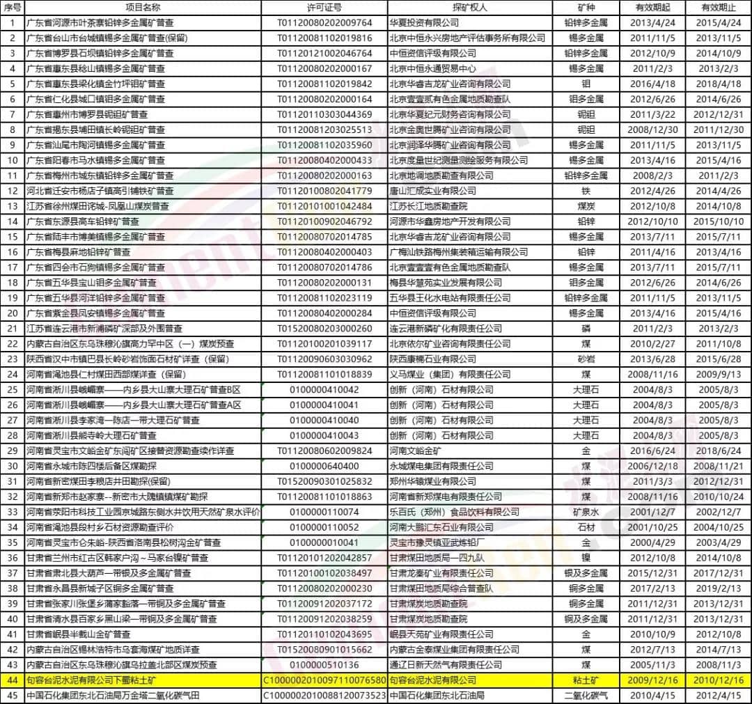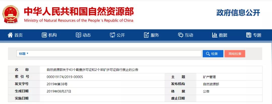 日前,自然资源部发布《关于43个勘查许可证和2个采矿许可证自行废止的公告》称:根据《矿产资源勘查区块登记管理办法》(1998年国务院令第240号)第十条、《矿产资源开采登记管理办法》(1998年国务院令第241号)第七条、《国土资源部关于进一步规范矿产资源勘查审批登记管理的通知》(国土资规〔2017〕14号)第十三条和《国土资源部关于完善矿产资源开采审批登记管理有关事项的通知》(国土资规〔2017〕16号)第二十二条的规定,经核实,“广东省河源市叶茶寨铅锌多金属矿普查”等43个探矿权、“句容台泥水泥有限公司下蜀粘土矿”等2个采矿权在勘查许可证或采矿许可证有效期届满前未依法申请办理延续登记手续,勘查许可证和采矿许可证自有效期届满之日起已自行废止,现予以公告。