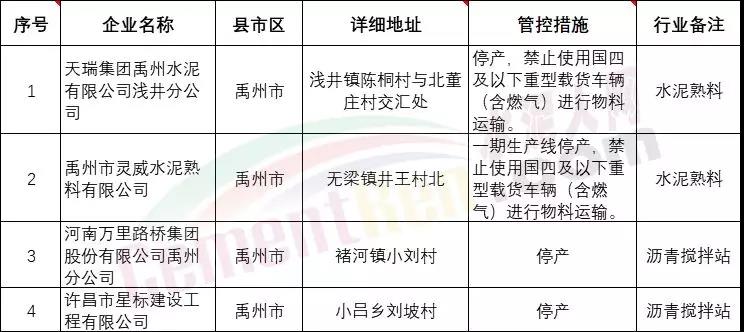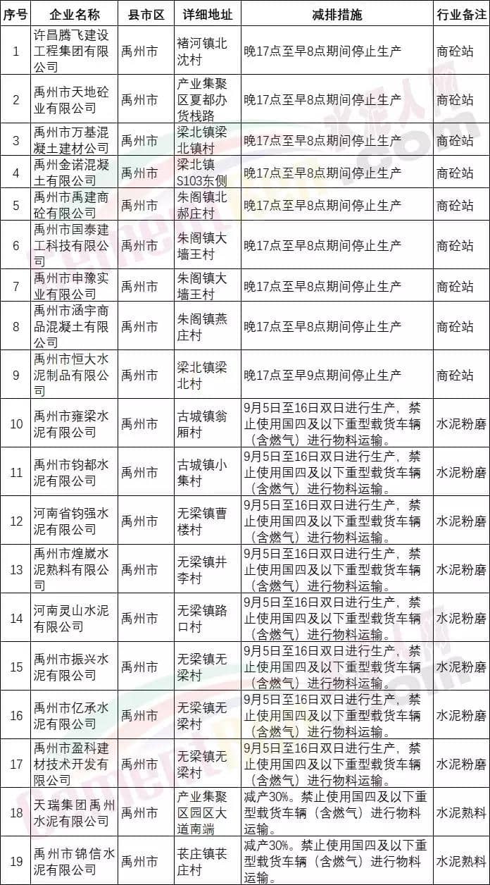 1、停产类企业。天瑞集团禹州水泥有限公司浅井分公司水泥熟料生产线、河南省湖波灵威水泥集团有限公司一期水泥熟料生产线、烧结砖瓦企业(9月6日前停产到位)、沥青搅拌站自9月5日起停产到位。