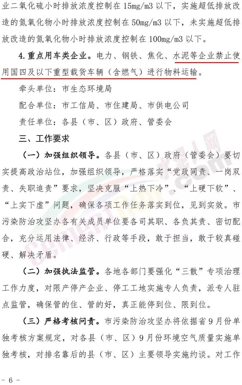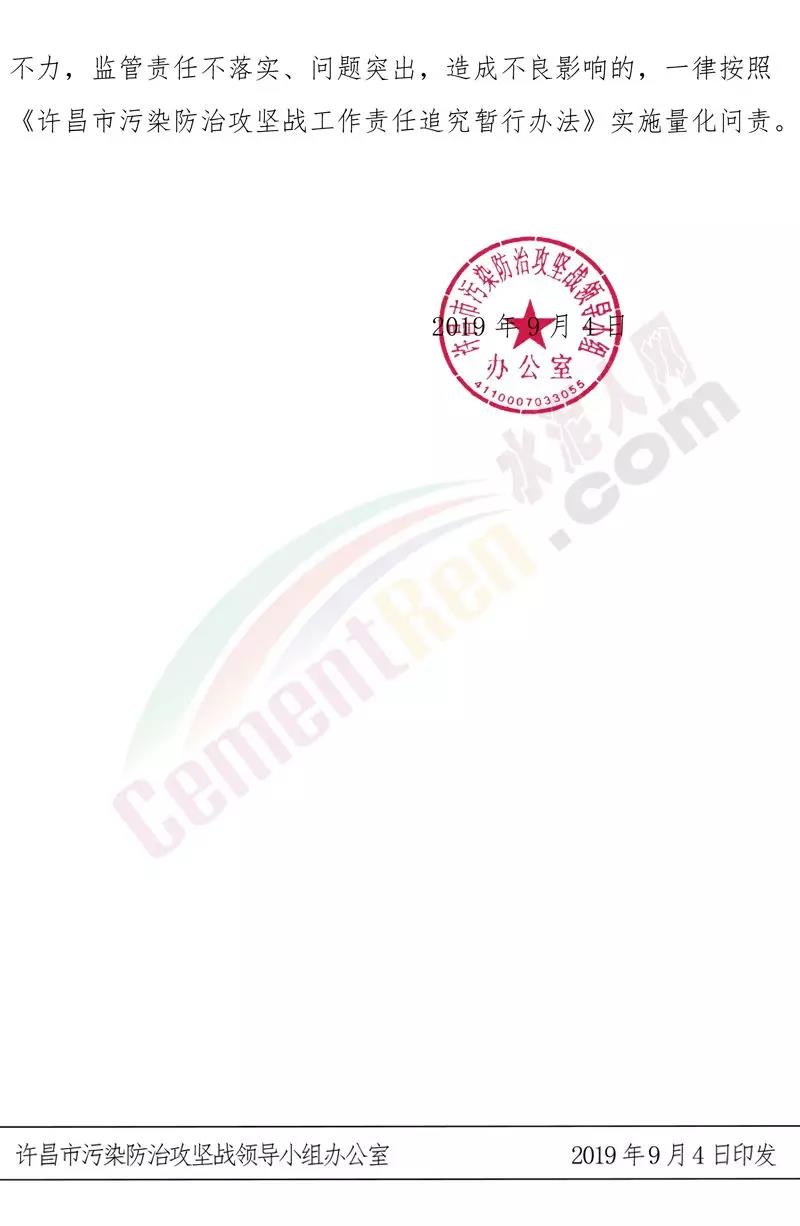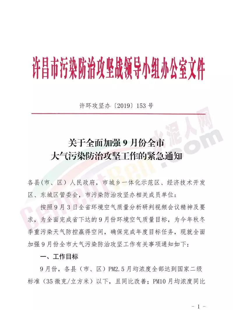水泥人网消息:日前,许昌市污染防治攻坚战领导小组办公室发布《关于全面加强9月份全市大气污染防治攻坚工作的紧急通知》称按照9月3全省环境空气质量分析研判视频会议精神及要求,为全面完成河南省下达的9月份环境空气质量目标,为今年秋冬季重污染天气防控赢得空间,确保完成年度目标任务,就全面加强9月份全市大气污染防治攻坚工作有关事项中包括强力实施工业减排,9月5日~16日期间,各县(市、区)工业企业颗粒物、二氧化硫、氮氧化物和挥发性有机物减排比例分别达到全社会排放总量20%以上。具体招待以下管控要求为: