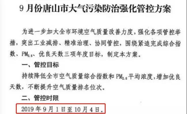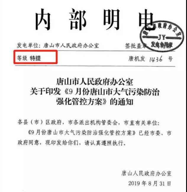 近日,唐山市人民政府发布《9月份唐山市大气污染防治强化管控方案》的特提文件。该文件对于当地钢铁、焦化、水泥、玻璃等工业企业的错峰时间进行了明确的要求。而该文件与以往最大的区别,他是一份水泥行业非常少见的特提文件,那特提文件与其他文件的区别又是什么呢?据水泥人网了解, 为了确保公文的时效性,使紧急事项得以及时处理,对紧急公文必须注明紧急程度.,在公文中分别标明”特提,特急,加急,平急” 从左到右紧急程度依次降低.,特提属于最高级。“特提”文件需要马上办理,要求一天之内办完;而“特急”文件需在8小时内阅办,是要求三天之内办完;“加急”文件需在24小时内阅办,是要求五天之内办完。这足以看出此次停产的重要性和紧迫性。