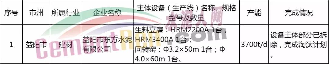 益阳市人民政府以《关于请求对益阳市东方水泥有限公司淘汰退出产能完成情况进行公告的函》(益政函〔2019〕102号)提出公告申请,现对益阳市东方水泥有限公司淘汰项目完成情况予以公告。