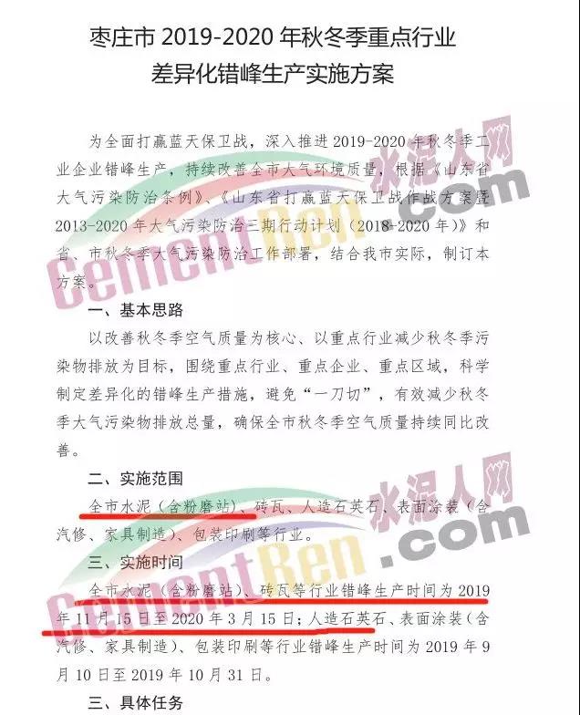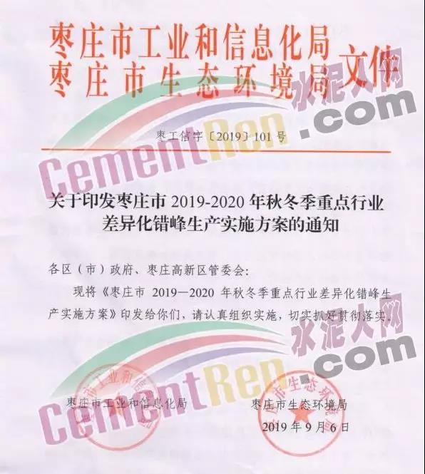 与此同时,水泥大省山东省枣庄市工业和信息化局、枣庄市生态环境局发布《关于枣庄市2019~2020年秋冬季重点行业差异化错峰生产实施方案的通知》称,为全面打赢蓝天保卫战,深入推进2019~2020年秋冬季工业企业错峰生产,持续改善全市大气环境质量,根据《山东省大气污染防治条例》、《山东省打赢蓝天保卫战作战方案暨2013~2020年大气污染防治三期行动计划(2018~2020年)》和省、市秋冬季大气污染防治工作部署,结合我市实际,制定本方案。