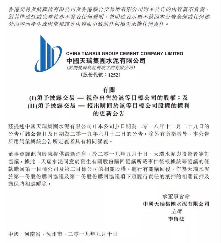 于2019年9月10日,该公司全资附属天瑞水泥与投资者签订协议,天瑞水泥同意于发生有关股份购回协议所载事件后根据该等协议的条款购回第一目标公司天瑞集团郑州水泥有限公司及第二目标公司大连天瑞水泥有限公司的相关股权。