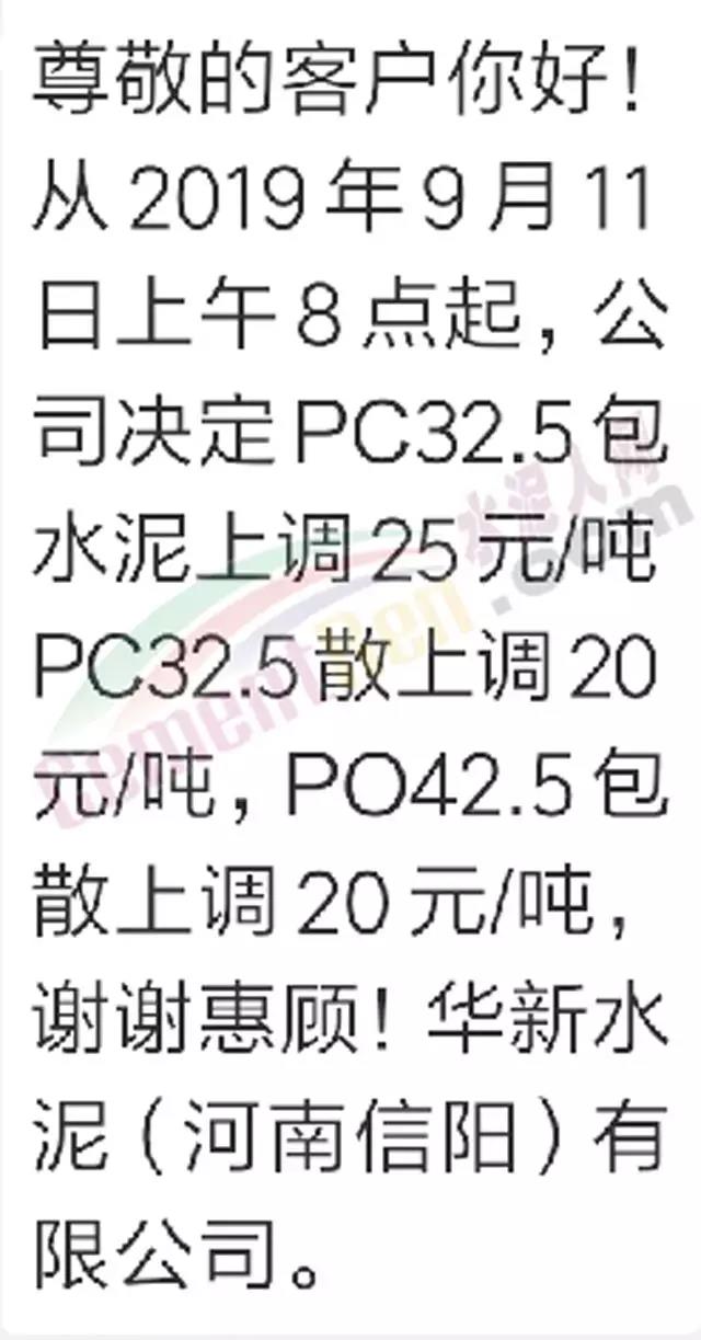 其中,华新水泥(河南信阳)有限公司11日发通知称自9月11日上午8点起PC32.5包装水泥价格上调25元/吨,散装上 调20元/吨。PO42.5水泥(包散)上 调20元/吨。
