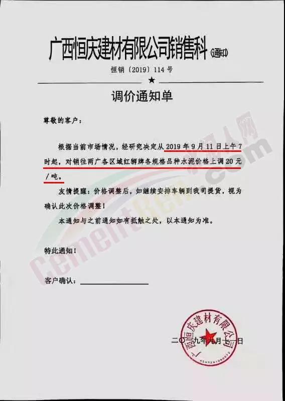 广西恒庆建材有限公司调价通知称,根据当前市场情况,经研究决定从9月11日上午7时起,对销往两广各区域红狮牌各规格品种水泥价格上调20元/吨。