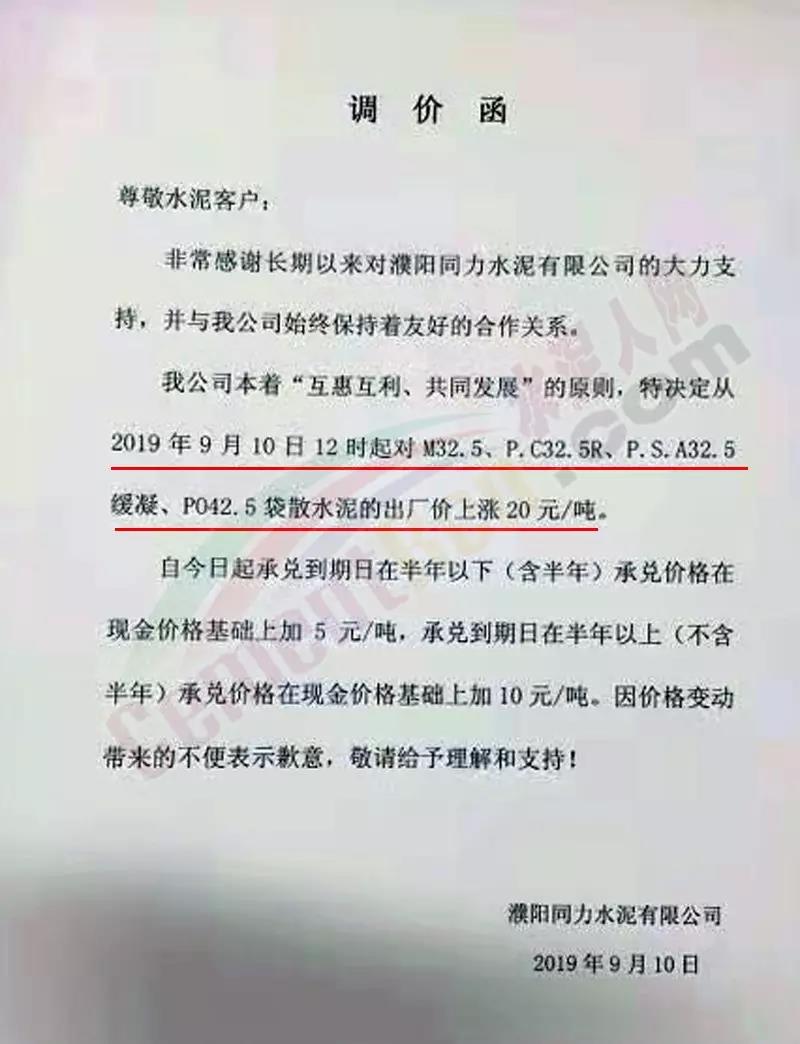 濮阳同力水泥有限公司9月10日调价函称,自9月10日12时起对旗下多个32.5级水泥及PO.42.5袋散水泥出厂价上调20元/吨。