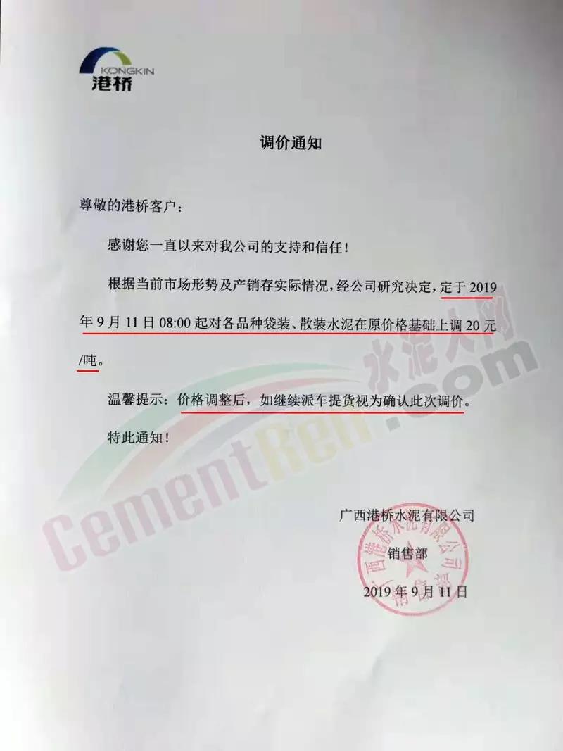 广西港桥水泥有限公司销售部调价通知称定于9月11日8时起对各品种袋装、散装水泥在原价格基础上上调20元/吨。