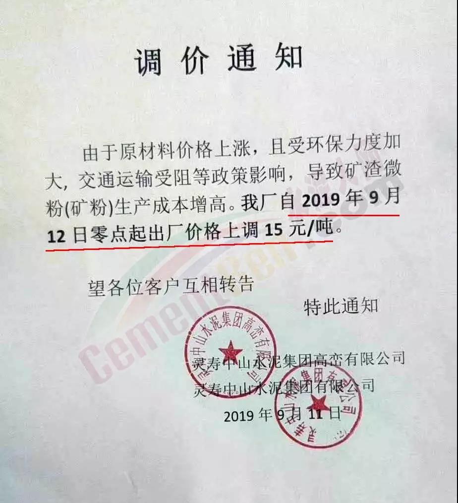 据水泥人网了解,位于河北省石家庄市灵寿县的灵寿中山水泥集团高峦有限公司昨日(9月11)发调价通知称,由于原材料价格上涨,且受环保力度加大,交通运输受阴等政策影响,导致矿渣微粉(矿粉)生产成本增高。工厂自今日(9月12日)零点起出厂价格上调25元/吨。