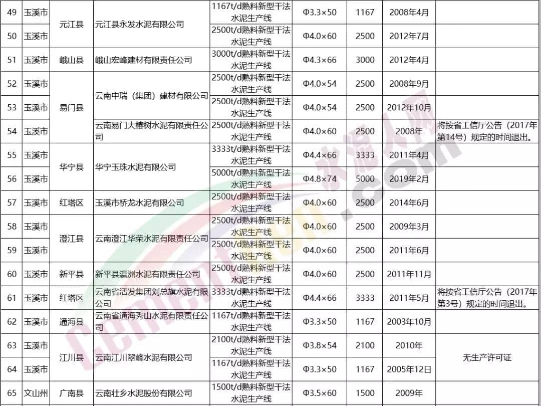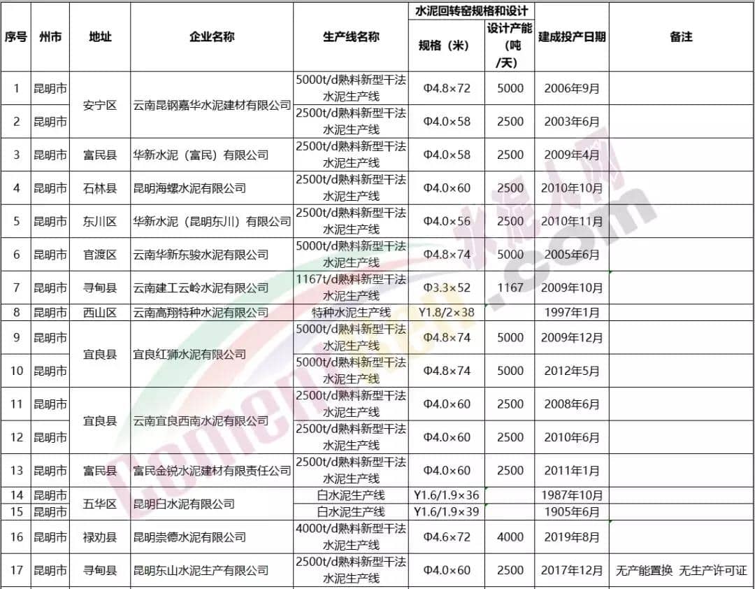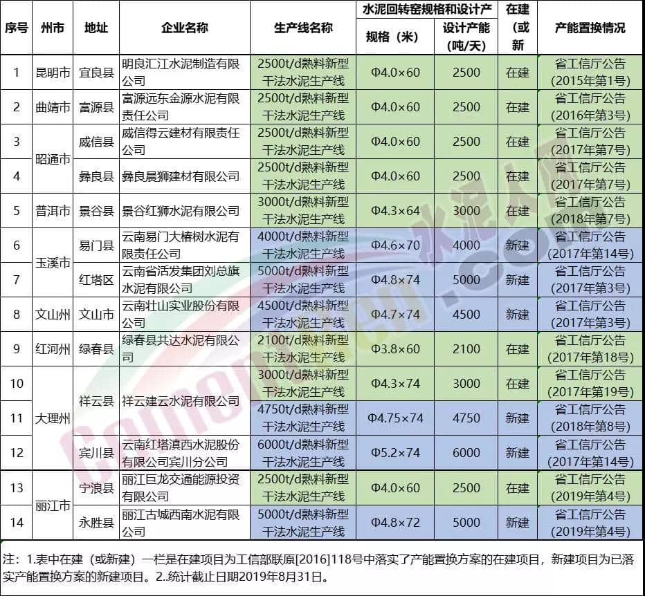 水泥人网消息:日前,云南省工信厅公布了云南省水泥熟料生产线清单。清单显示截止日期2019年8月31日,云南省共有117条建成水泥熟料生产线。其中有8条生产线没有生产许可证,11条生产线将陆续淘汰退出;14个新建水泥熟料项目,其中在建项目8个,新建项目6个。