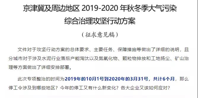 日前,水泥人网转发了《京津冀及周边地区2019-2020 年秋冬季大气污染综合治理攻坚行动方案(征求意见稿)》。并有针对性的划出了重点。其中提到国家相关部门将于2019年的10月1日到2020年的3月31日对2+26城市进行环境问题专项整治 。(相关链接:“停工令”又来了!为期6个月!涉及28个城市!)消息一出,引起广泛关注。有网友留言称,停限产或将导致一波水泥价格上涨。