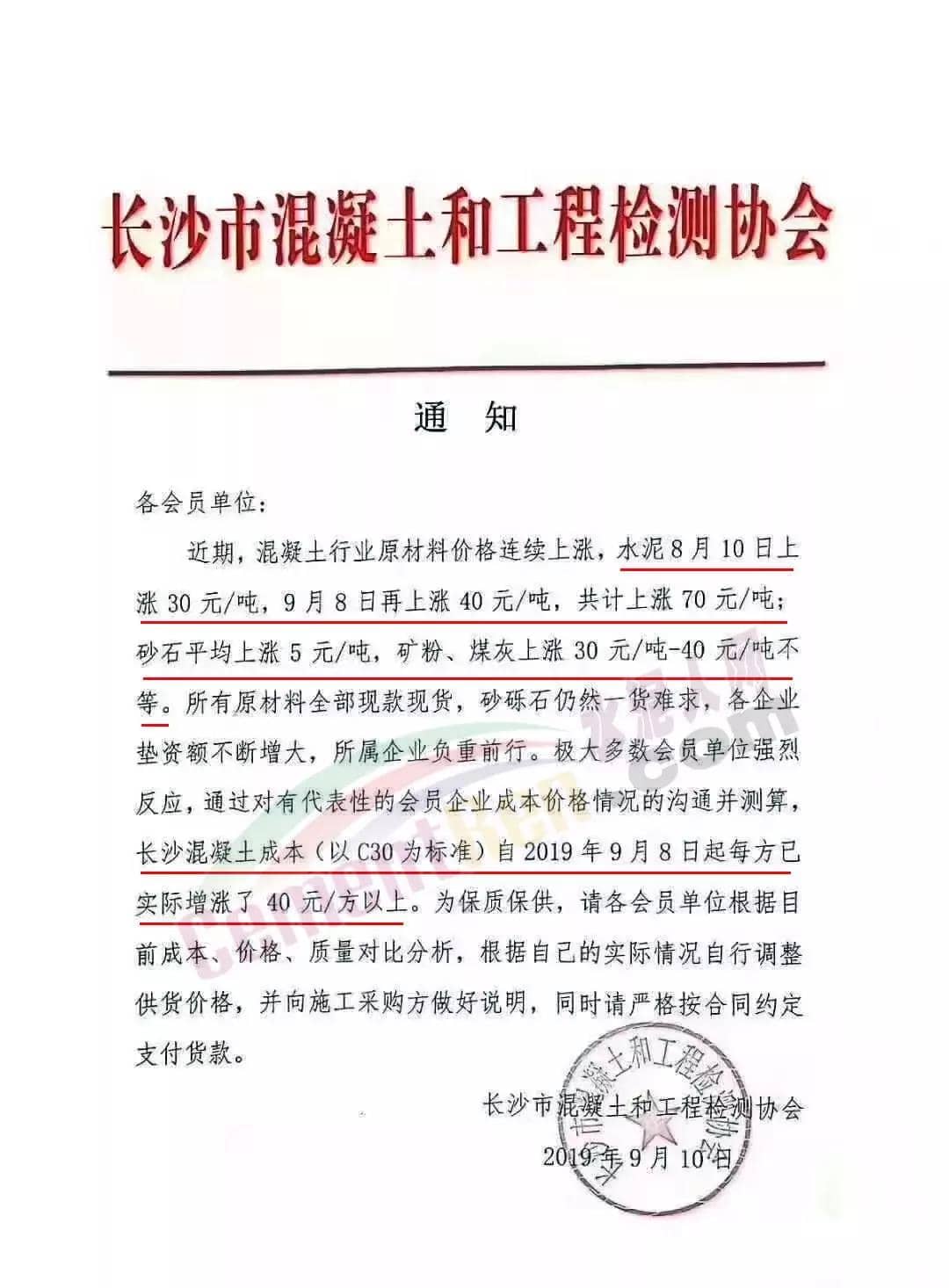 据水泥人网了解,本周二(17日)安徽六安地区混凝土行价格出现小幅上涨5元/方,市区主流品牌C30混凝土含税非泵送价格在565-575元/方;湖南衡阳原料价格上涨,混凝土随之上浮5-10元/方,C30非泵市场报价415-435元/方。除上述区域外,近期华东区域混凝土价格亦出现小幅上涨,12日前后山东滨州、淄博以及安徽芜湖及铜陵混凝土价格小幅上调5元/方;华中湖南长沙部分区域上涨40元/方。详情如下:日前,湖南省长沙市混凝土和工程检测协会发布通知称,近期长沙混凝土行业原材料价格连续上涨,水泥8月10日上涨30元/吨,9月8日再上涨40元/吨,共计上涨70元/吨;砂石平均上涨5元/吨,矿粉、煤灰上涨30-40元每吨不等。所有原材料全部现款现货,砂砾石仍然一货难求,各砼企垫资额不断增大,所属企业负重前行。经大多数会员单位强烈反映,通过对有代表性的会员企业成本价格情况的沟通并测算,长沙混凝土成本(以C30为标准)自2019年9月8日起每方已实际增涨了40元以上。为了在保质保量,建议各单位对目前成本,价格,质量对比分析。根据自己的实际情况自行调整供货价格,并向施工采购方做好说明,同时请严格按照合同约定支付货款。