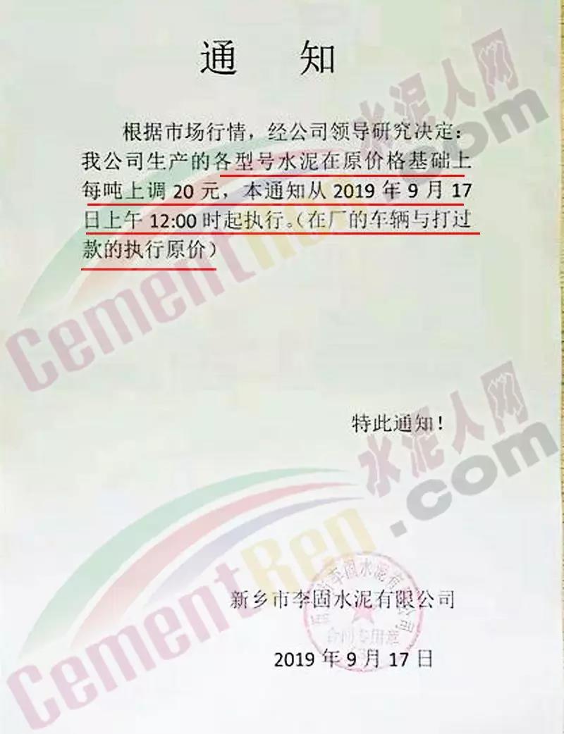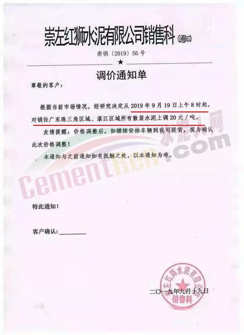 水泥人网消息:日前,崇左红狮水泥销售科通知:自今日(9月19日)上午8时起对销往广东珠三角、湛江区域区域所有散装水泥上调20元/吨。