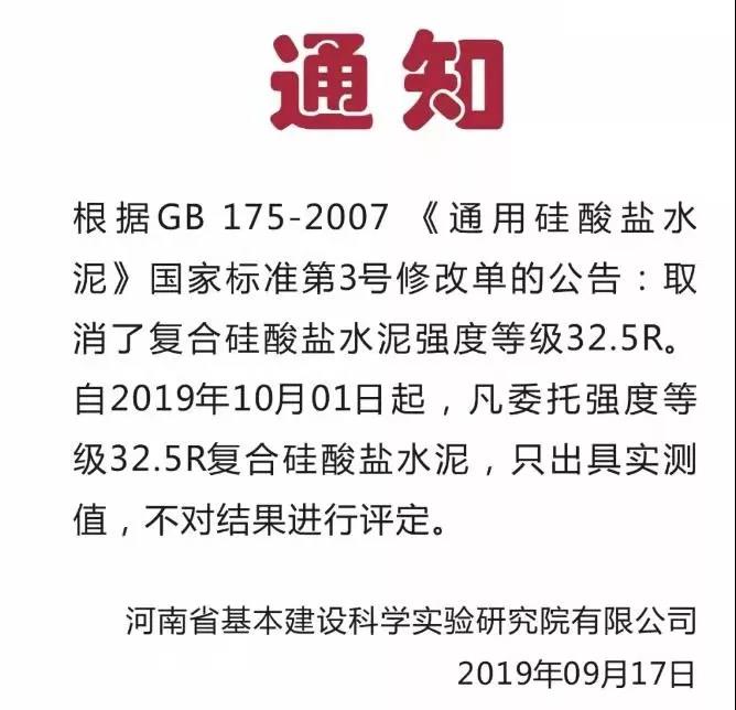 水泥人网通讯员消息:日前,河南省基本建设科技实验研究有限公司通知,根据GB 175-2007《通用硅酸盐水泥》国家标准第3号修改单的公告,取消了复合硅酸盐水泥强度等级32.45R,自2019年10月1日起,凡委托强度等级32.5R复合硅酸盐水泥,只出具实测值,不对结果进行评定。