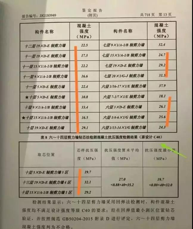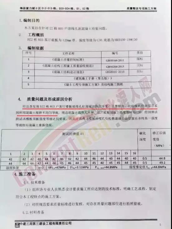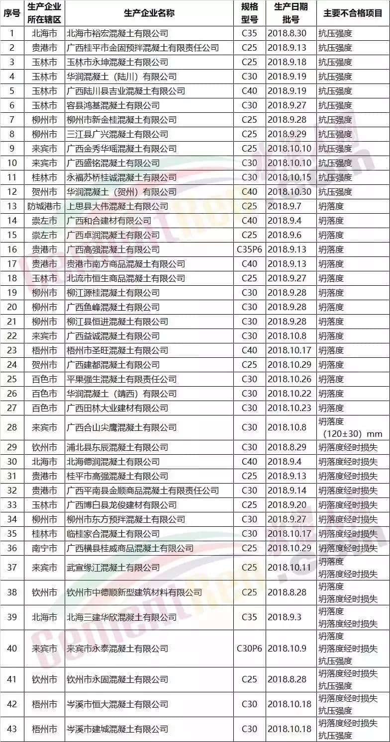 2018年7月,中康绿城百合花园项目部分楼房曾因质量问题被冠以“胶带楼房”之名。记者多次探访,并从多个信息源了解到,该项目2017年4月开工建设,但其中已接近封顶的9号楼、14号楼、15号楼、16号楼,因混凝土强度不达标导致部分楼层的楼板、墙壁等出现严重裂缝。这一情况被诸多业主无意中发现后,引发强烈不满。2018年4月份,天津市城乡建设委员会对粤翠名邸存在的质量问题进行处理情况通报,建设楼体的混凝土强度应为C25,而施工时却使用的是C15。导致结构强度不够,将会导致整体结构强度不够,带来极大的安全隐患。天房集团决定,将该项目已经全部完成的18栋住宅主体建筑拆除重建。……混凝土强度不足,建筑物就存在安全隐患,使用寿命也会缩短,可能达不到设计要求年限就不能使用了,严重的会造成墙体倒塌甚至整栋楼倒塌。混凝土强度不符合设计要求,还会使建筑物的抗震级别及应对其他极端情况的能力大打折扣。据某检测机构负责人介绍:混凝土最常见的不合格问题就是抗压强度不够,而水泥最常见的质量不合格是因为氯离子超标所致。水泥中氯离子超标会产生电化学反应,使钢筋表面的铁不断失去电子而溶于水从而被腐蚀。同时还会在钢筋表面形成红铁锈,导致体积膨胀使混凝土结构开裂。混凝土强度不达标使混凝土碳化深度增大,降低使用寿命,极大地影响建筑结构的安全性和耐久性。据水泥人网了解,混凝土外加剂产品市场竞争激烈,价格战的结果就是滥用原材料、以次充好的现象时有发生,用户过分追求低价格也助长了这种现象的多发。外加剂的品种、配比不当:在防冻剂中,防冻剂数量不足;在泵送剂或缓凝减水剂中,缓凝剂的用量过大或羟基羧酸盐缓凝剂未随使用温度的升降而增减;早强剂用量过大,配比不当等,都会造成混凝土强度下降。在混凝土拌制过程中外加剂超掺严重,会造成混凝土强度永久性不足。同样,掺量少也会降低混凝土强度,特别是有减水功能的外加剂,如泵送剂、减水剂等,由于掺量的减少,往往会增加拌合水的用量,从而造成混凝土强度不足。近期被通报的部分混凝土企业产品抽检不合格名单: