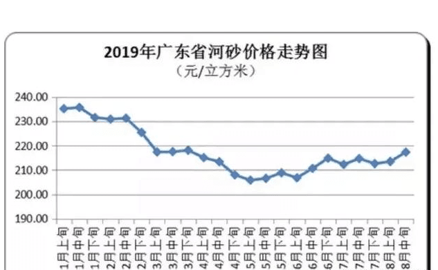 受多区域禁采以及各种的政策前提下多区域出现砂石价格飚涨,而且还伴随着供需紧缺的情况。据了解,2019年以来,随着河南、河北、湖北、江西等地相继发布砂石禁采文件,砂石供应量大幅减少。截止8月中旬,广东全省河砂平均购进价为每立方米217元,较8月上旬上升涨1.8%。其中,粤西和珠三角地区购进价涨幅较大,均价分别为每立方米220元和200元,环比分别上升3.53%和3.61%。