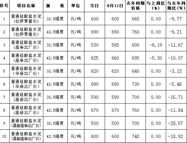 西藏自治区发展和改革委员会发布拉萨市场主要建材价格周报。据监测数据显示,2019年第38周,全区水泥价格小幅下降,钢材、木材、玻璃、民爆物品价格平稳。水泥:1、重点项目价格执行情况:高争建材、华新水泥、高新雪莲、昌都高争针对全区重点项目销售的水泥继续执行政府指导价,分别为32.5(强度)500元、42.5(强度)600元、52.5(强度)800元。2、非重点项目出厂价格:拉萨高争环比分别下降6.19%、5.3%;其余三家企业针对全区非重点项目供应的水泥出厂价格与上周比持平。3、拉萨市场平均零售价:与上周比,拉萨市场32.5(强度)、42.5(强度)水泥价格持平;与去年同期比,32.5(强度)、42.5(强度),同比分别下降9.77%、9.21%。