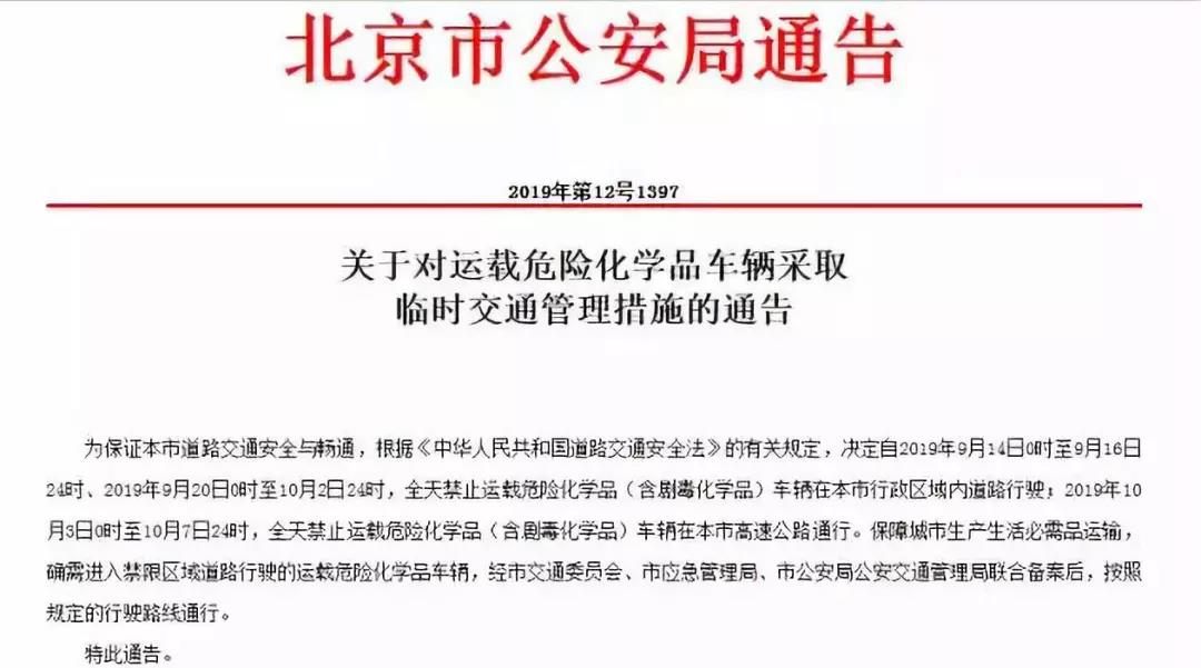 北京市:黄标车市内限行,危化车高速也限行1、每天6时至23时,五环路(不含)以内道路禁止载货汽车通行,五环路主路禁止核定载质量8吨(含)以上载货汽车通行。2、排放达不到国Ⅲ标准的柴油车,全天禁止进入六环路(含)以内道路和远郊区县城关镇主要道路通行;本市相关部门不予办理营运证和通行证。3、9月20日0时至10月2日24时,全天禁止运载危险化学品(含剧毒化学品)车辆在本市行政区域内道路行驶;2019年10月3日0时至10月7日24时,全天禁止运载危险化学品(含剧毒化学品)车辆在本市高速公路通行。