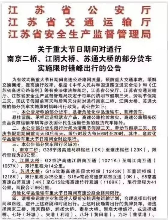 湖南省:全省禁行危险品车辆2019年10月1日0时至2019年10月8日6时,湖南全省高速公路禁止危险化学品运输车辆通行。