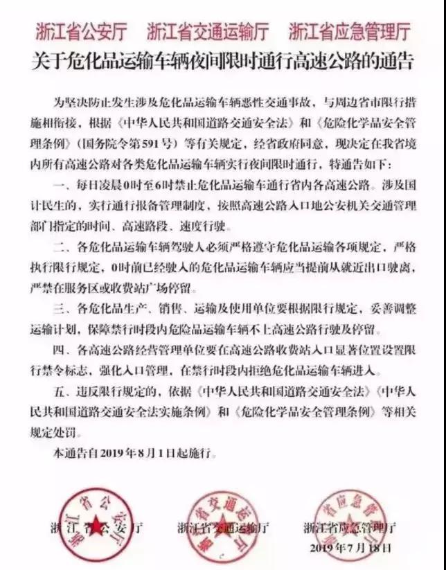 2019年8月1日起,每日0时至6时全省高速公路禁止危险化学品运输车辆通行,其他时间段不限行。