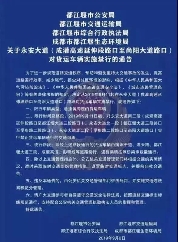 四川省:国庆期间全天禁行1、全省高速公路禁止危险化学品运输车辆通行。2、成都市全市每日07:30-20:00限行国四以下排放货车。
