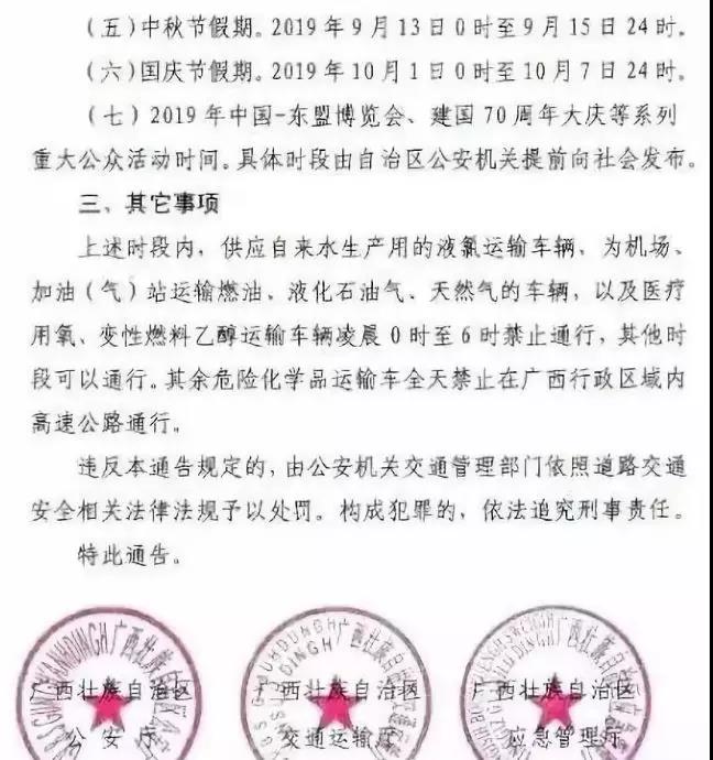 根据广西壮族自治区公安厅、交通运输厅、安全生产监督管理局等联合发布公告文件,2019年10月1日零时至10月7日24时,广西壮族自治区全区域高速公路禁止危险货物运输车辆通行。物流停限,生产停限,严查超载,再加上时不时发生的交通事故,大载车司机的无奈只有自己才能体会。