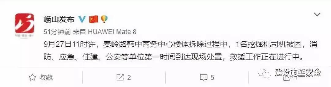 微博内容截图据崂山发布官方微博发布消息称,9月27日11时许,青岛市崂山区秦岭路韩中商务中心楼体拆除过程中,1名挖掘机司机被困,消防、应急、住建、公安等单位第一时间到达现场处置,救援工作正在进行中。 据知情人透露,该项目的拆除工作是由和达集团进行施工,现场突发意外整个楼体瞬间崩塌,挖掘机被埋。事故现场正进行多方救援
